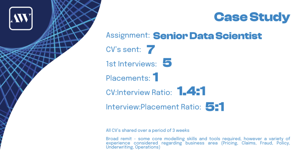 This assignment had a fairly broad set of requirements. Whilst they were looking for core Data Science skills and experience – as a minimum, Machine Learning modelling in Python, with experience of other approaches and solutions, such as Deep Learning/ NN’s, NLP, GenAI/LLM’s and Image Recognition being a bonus – they were also very open as to where these skills had been applied. Insurance sector experience was preferred, but open as to which business areas projects had been delivered in, they were keen to consider candidates with experience in Pricing, Claims, Fraud, Policy Documentation, Underwriting, Customer Services and/or Operations.