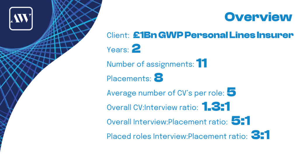 The numbers in the carousel are an honest, ‘no-filter’ assessment of a recent two year period for which Alexander Williams Recruitment has assisted a circa £1Bn leading personal lines insurer with their Pricing & Data Science recruitment.