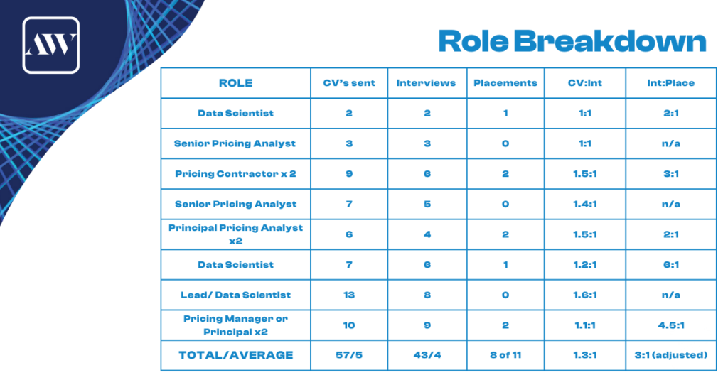 The Interview to Offer ratio would be even more impressive – one detail left out is that of the 8 successful placements, only 9 offers were extended. We can’t of course take all the credit for this, this is due to the culture and environment the pricing and data science leadership teams have fostered, and the processes they have employed for recruitment, meaning candidates typically get to the end of the process highly enthused about the prospect of working there. And the way they have worked with us, allowing us to give genuine insight to potential candidates about working there, has been hugely beneficial in enabling us to get the initial interest from potential candidates, as well as keeping them engaged throughout the process.