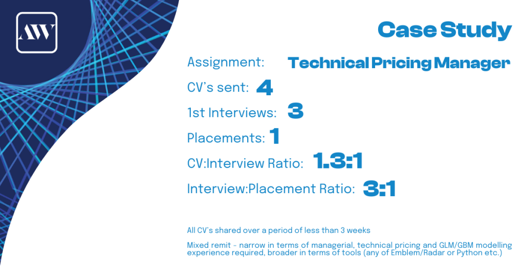 This role had a narrow remit, in terms of required experience candidates must demonstrate. All were required to have deep knowledge of Technical Pricing, hands-on experience of building predictive models for claims frequency and severity, and ideally for UK personal lines products. The only real flexibility was whether these models were statistical/GLM, or using Machine Learning techniques such as GBM’s, and what tools were used (either Emblem/Radar or Python).